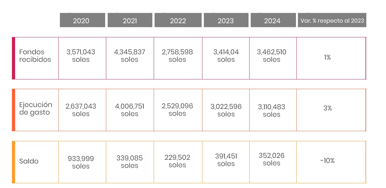 SER tuvo a disposición, durante el 2024, fondos por un total de S/. 3´462,510, proveniente de 12 agencias de cooperación internacional y financieras, para ejecutar 19 proyectos. La ejecución total durante el 2024, fue de S/. 3´110,483. Restando S/.352,026 de saldo para ejecutar en el 2025.