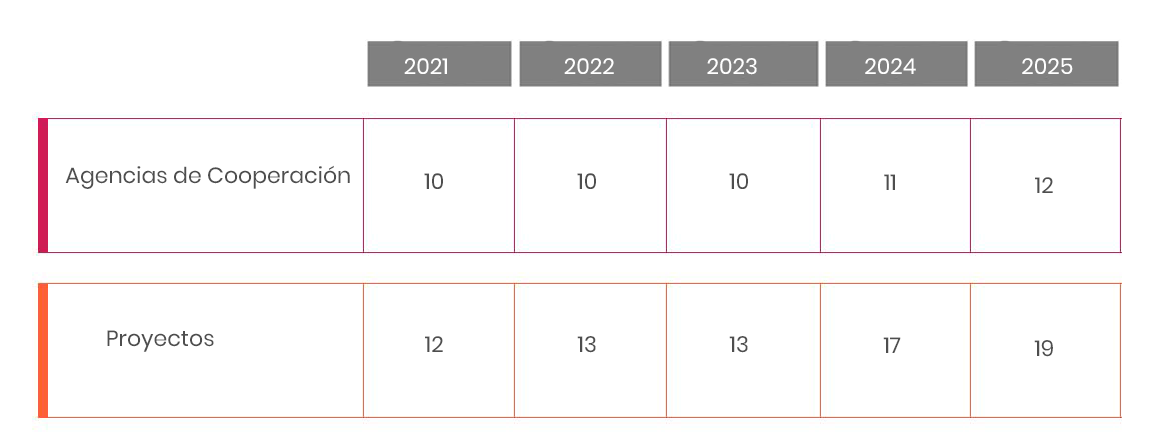 Asimismo, hemos mantenido relaciones con 12 agencias de cooperación para financiar nuestros proyectos, que en los años ascendieron a 19, el mayor en los últimos cinco años en gran parte por la reducción promedio de los montos comprometidos.