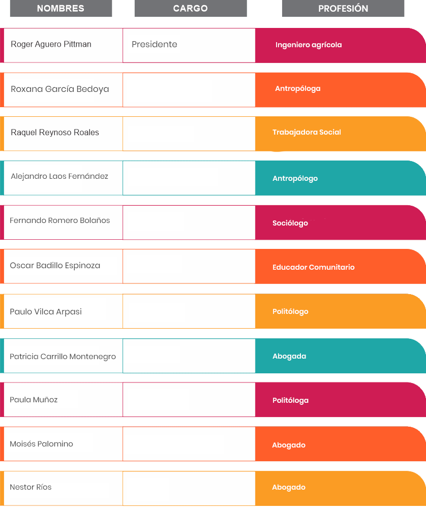 Trabajadora social, con post grado en conflictos y desarrollo, género y dinamización social, monitoreo y evaluación de proyecto sociales. Con amplia experiencia en metodologías participativas en temas de educación ciudadana, memorias colectivas, diagnósticos rurales participativos. Asimismo cuenta con más de 30 años de labor en la gestión de proyectos de promoción y desarrollo social. Es parte del Consejo Directivo SER y ha ejercido su presidencia entre el 2016-2021. Es miembro de la Coalición Internacional por la Tierra, representante ante la Coordinadora Nacional de Derechos Humanos y ha integrado la Comisión Multisectorial de Alto Nivel encargada del seguimiento de las acciones y políticas de Estado en los ámbitos de la paz, la reparación colectiva y la reconciliación nacional – CMAN.