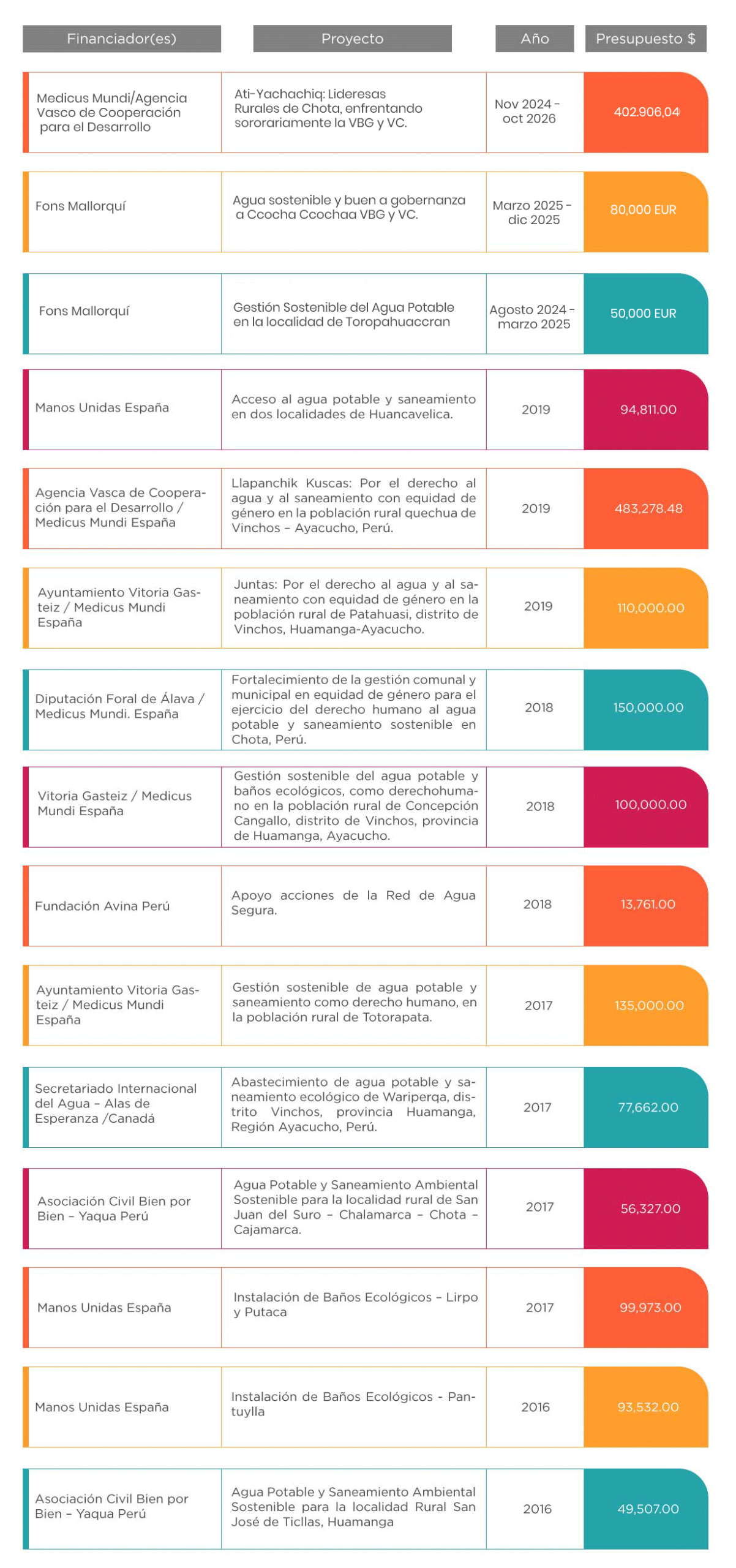 Dirigido a contribuir a que las poblaciones rurales y periurbanas tengan acceso a los servicios sostenibles de agua potable y saneamiento. Una de las principales actividades es la ejecución de sistemas de agua potable y saneamiento, que consiste en la construcción de obras civiles y capacitación en educación sanitaria, gestión, administración para el sistema. Además realiza consultorías y participa en redes del Comité Sectorial de Agua y del Consorcio de Agua Saneamiento y Medio Ambiente.